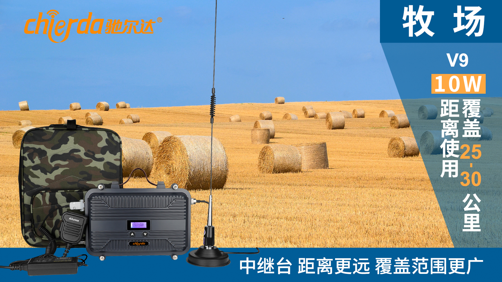 5)V9中繼臺(tái),10W, 可補(bǔ)充對(duì)講機(jī)設(shè)備使用,可覆蓋25-30公里的牧場(chǎng)。